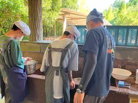 部屋の掃除がおわってチェックに合格したら、いよいよお楽しみの「野外炊飯」です!