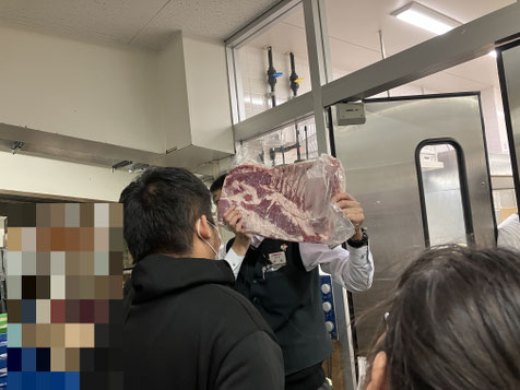 また、お肉コーナーでは、機械でスライスする前の大きなお肉を見せていただくことができました。